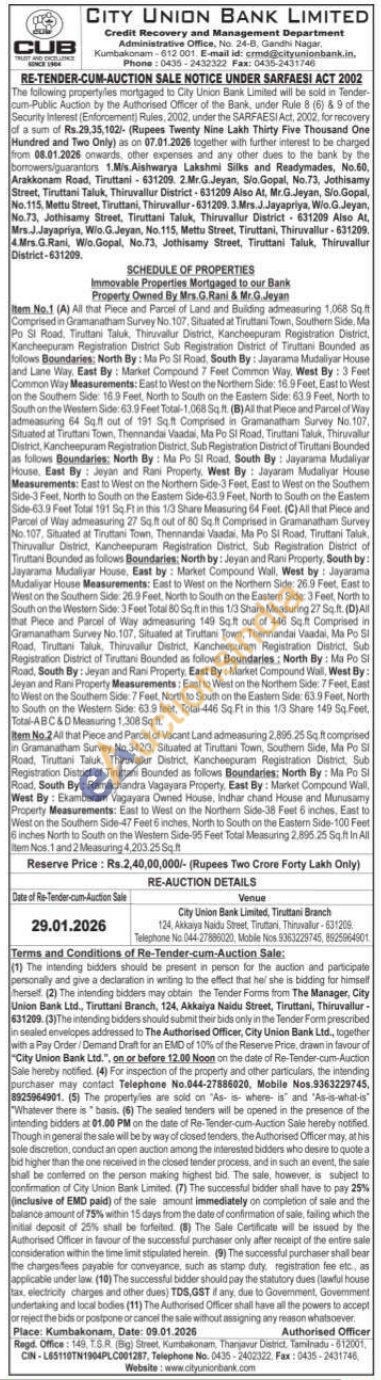 Bem. No.1 (A) All that Piece and Parcel of Land and Building admeasuring 1,068 Sqf Comprised in Gramanatham Survey No. 107, Situated at Tiruttani Town, Southern Side, Ma Po Si Road, Tiruttani Taluk, Thiruvallur District, Kancheepuram Registration District, Kancheepuram Registration District Sub Registration District of Tiruttani Bounded as follows Boundaries: North By: Ma Po St Road, South By: Jayarama Mudaliyar House and Lane Way, East By: Market Compound 7 Feet Common Way, West By: 3 Feet Common Way Measurements: East to West on the Northern Side: 16.9 Feet, East to West on the Southem Side: 16.9 Feet, North to South on the Eastem Side: 63.19 Feet, North to South on the Westem Side: 63.9 Feet Total-1.068 Sq.ft. (B) All that Piece and Parcel of Way admeasuring 64 Sq.ft out of 191 Sqft Comprised in Gramanatham Survey No 107, Situated at Tiruttani Town, Thennandai Vaadal, Ma Po SI Road, Tiruttani Taluk, Thiruvallur District, Kancheepuram Registration District, Sub Registration District of Tiruttani Bounded as follows Boundaries: North By: Ma Po SI Road, South By: Jayarama Mudaliyar House, East By: Jeyan and Rani Property, West By: Jayaram Mudaliyar House Measurements: East to West on the Northern Side-3 Feet, East to West on the Southem Side-3 Feet, North to South on the Eastem Side-63.9 Feet, North to South on the Eastem Side-63.9 Feet Total 191 Sq. Ft in this 1/3 Share Measuring 64 Feet. (C) All that Piece and Parcel of Way admeasuring 27 Sq.ft out of 80 Sq.ft Comprised in Gramanatham Survey No. 107, Situated at Tiruttani Town, Thennandai Vaadai, Ma Po SI Road, Tiruttani Taluk Thiruvallur District, Kancheepuram Registration District, Sub Registration District of Tiruttani Bounded as follows Boundaries: North by: Jeyan and Rani Property, South by: Jayarama Mudaliyar House, East by: Market Compound Wall, West by: Jayarama Mudaliyar House Measurements: East to West on the Northern Side: 26.9 Feet, East to West on the Southern Side: 26.9 Feet, North to South on the Eastern Side: 3 Feet, North to South on the Western Side: 3 Feet Total 80 Sq.ft in this 1/3 Share Measuring 27 Sq.ft. (D)All that Piece and Parcel of Way admeasuring 149 Sq.ft out of 446 Sqft Comprised in Gramanatham Survey No. 107, Situated at Tiruttani Town, Thennandai Vaadai, Ma Po Si Road, Tiruttani Taluk, Thiruvallur District, Kancheepuram Registration District, Sub Registration District of Tiruttani Bounded as follows Boundaries: North By: Ma Po Si Road, South By: Jeyan and Rani Property: East By: Market Compound Wall, West By: Jeyan and Rani Property Measurements: East to West on the Northem Side: 7 Feet, East to West on the Southem Side: 7 Feet, North to South on the Eastern Side: 63.9 Feet, North to South on the Western Side: 63.9 feet, Total-446 Sq. Ft in this 1/3 Share 149 50 Feet, Total-ABC&D Measuring 1,308 Sq.ft. Item No.2 All that Piece and Parcel of Vacant Land admeasuring 2,895.25 Sq ft comprised in Gramanatham Survey No.3423, Situated at Tiruttani Town, Southem Side, Ma Po Si Road, Tiruttani Taluk, Thiruvallur District, Kancheepuram Registration Distict, Sub Registration District of Tiruttani Bounded as follows Boundaries: North By: Ma Po St Road, South By: Ramachandra Vagayara Property. East By: Market Compound Wall, West By: Exambaram Vagayara Owned House, Indhar chand House and Munusamy Property Measurements: East to West on the Northem Side-38 Feet 6 inches, East to West on the Southem Side-47 Feet 5 inches, North to South on the Eastern Side-100 Feet 6 inches North to South on the Western Side-95 Feet Total Measuring 2,895.25 Sqft In All Item Nos. 1 and 2 Measuring 4,203.25 Sqft
