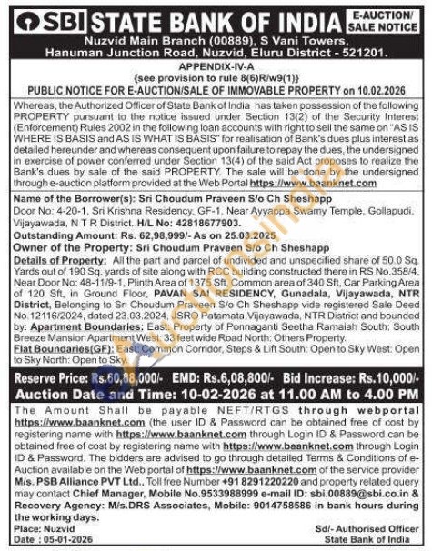 Details of Property: All the part and parcel of undivided and unspecified share of 50.0 Sq. Yards out of 190 Sq. yards of site along with RCC building constructed there in RS No.358/4, Near Door No: 48-11/9-1, Plinth Area of 1375 Sft, Common area of 340 Sft, Car Parking Area of 120 Sft, in Ground Floor, PAVAN SAI RESIDENCY, Gunadala, Vijayawada, NTR District, Belonging to Sri Choudum Praveen Sio Ch Sheshapp vide registered Sale Deed No. 12116/2024, dated 23.03.2024, JSRO Patamata, Vijayawada, NTR District and bounded by: Apartment Boundaries; East: Property of Ponnaganti Seetha Ramalah South, South Breeze Mansion Apartment West: 33 feet wide Road North: Others Property.. Flat Boundaries(GF): East, Common Corridor, Steps & Lift South: Open to Sky West: Open to Sky North: Open to Sky.
