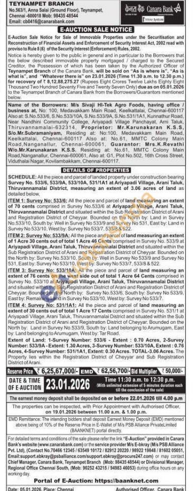 SCHEDULE: All the piece and parcel of landed property under construction bearing Survey No. 533/6, 533/94, 533/10A, 531/1A1 at Ariyapadi Village, Arani Taluk, Thiruvannamalai District, measuring an extent of 3.06 acres of land as detailed below ITEM 1: Survey No: 533/6; All the piece and parcel of land measuring an extent of 70 cents comprised in Survey No.533/6 at Ariyapadi Village, Arani Taluk, Thiruvannamalai District and situated within the Sub Registration District of Arani and Registration District of Cheyyar Bounded on the North by: Land in Survey No.533/10, South by: Well in Survey No 533/9 and Survey No 531, East by: Land in Survey No 533/10, West by: Survey No 533/7, 533/8 & 522. ITEM 2: Survey No: 533/9A: All the piece and parcel of land measuring an extent of 1 Acre 30 cents out of total 1 Acre 46 Cents comprised in Survey No. 533/9 at Ariyapadi Village, Arani Taluk, Thiruvannamalai District and situated within the Sub Registration District of Arani and Registration District of Cheyyar Bounded on the North by: Survey No.533/10. South by: Well in Survey No 533/9 and Survey No 531. East by: Survey No 533/10, West by: Survey No 533/7,533/8 & 522 ITEM 3: Survey No: 533/10A: All the piece and parcel of land measuring an extent of 76 cents on the west side out of total 1 Acre 64 Cents comprised in Survey No. 533/10 at Ariyapadi Village, Arani Taluk, Thiruvannamalai District and situated within the Sub Registration District of Arani and Registration District of Cheyyar, Bounded on the North by: Survey No.533/6, South by: Survey No 533/9, East by: Remaining Land in Survey No 533/10, Westby: Survey No 533/7. ITEM 4: Survey No: 531/1A1: All the piece and parcel of land measuring an extent of 30 cents out of total 1 Acre 17 Cents comprised in Survey No. 531/1 at Ariyapadi Village, Arani Taluk, Thiruvannamalai District and situated within the Sub Registration District of Arani and Registration District of Cheyyar. Bounded on the North by: Land in Survey No 533/9, South by: Land belonging to Arumugam, East by: Land belonging to Arumugam, West by: Tar Road Extent of Land: 1-Survey Number: 533/6 Extent: 0.70 Acres, 2-Survey Number: 533/9A-Extent: 1.30 Acres, 3-Survey Number: 533/10A, Extent: 0.76 Acres, 4-Survey Number: 531/1A1, Extent: 0.30 Acres. TOTAL-3.06 Acres. The Property lies within the Registration District of Cheyyar and Sub Registration District of Arani