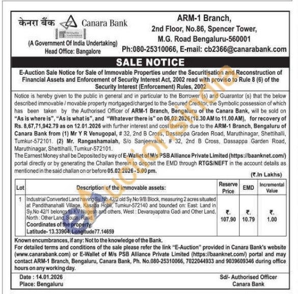 Industrial Converted Land having Sy. No.42/2 old Sy.No 9/8 Block, measuring 2 acres situated at Pandithanahalli Village, Kasaba Hobli, Tumkur-572140 and bounded on: East: Land in Sy.No 42/1 belongs to KV Nagesh and others, West: Devarayapatna Gadi and Other Land, North: Other Land, South: Road.