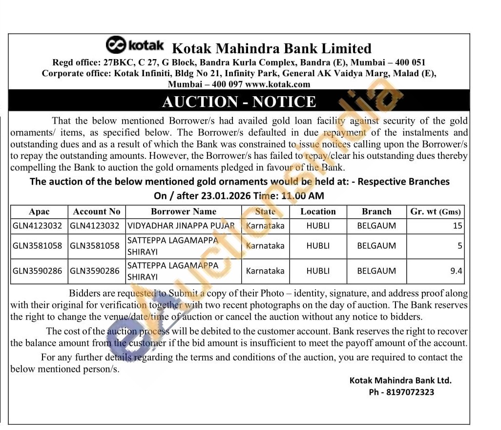 Kotak Mahindra Bank Gold Auctions Auction in Hubballi