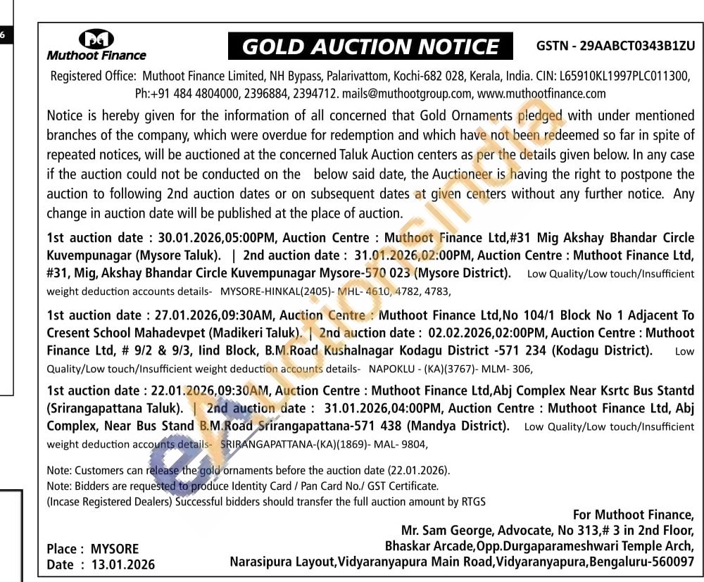 Muthoot Finance Ltd Gold Auctions Auction in Mysuru