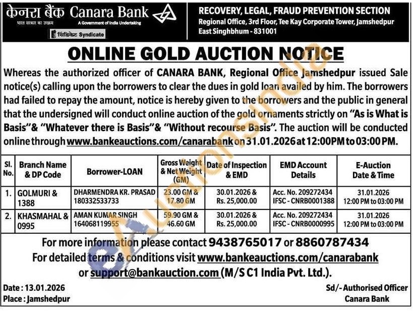 Canara Bank Gold Auctions Auction in East Singhbhum