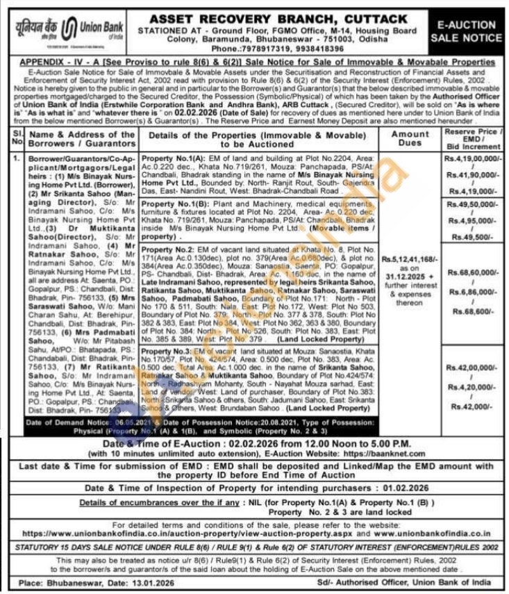 Property No.1(A): EM of land and building at Plot No. 2204, Area Ac.0.220 dec., Khata No.719/261, Mouza Panchapada, PS/At Chandbali, Bhadrak standing in the name of Mis Binayak Nursing Home Pvt Ltd., Bounded by. North- Ranjit Rout, South Gajendra Das, East- Nandini Rout, West: Bhadrak-Chandbali RoadProperty No.1(B): Plant and Machinery, medical equipments. furniture & fixtures located at Plot No. 2204, Area- Ac 0.220 dec. Khata No. 719/261, Mouza: Panchapada, PS/At: Chandbali, Bhadrak inside M/s Binayak Nursing Home Pvt Ltd. (Movable items /property).