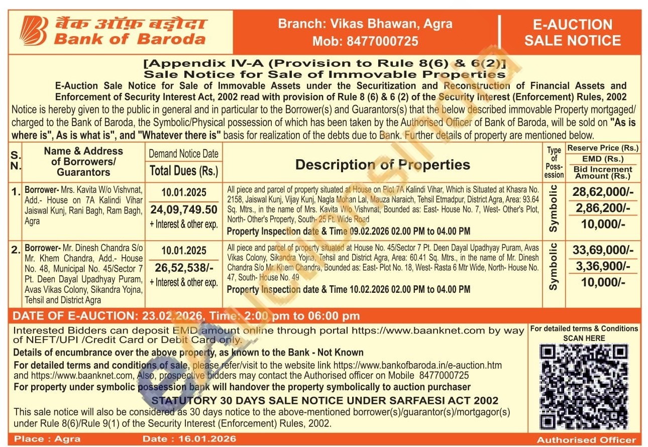 All piece and parcel of property situated at House No. 45/Sector 7 Pt. Deen Dayal Upadhyay Puram, Avas Vikas Colony, Sikandra Yojna, Tehsil and District Agra, Area: 60.41 Sq. Mtrs., in the name of Mr. Dinesh Chandra S/o Mr. Khem Chandra, Bounded as: East- Plot No. 18, West- Rasta 6 Mtr Wide, North- House No. 47, South-House No. 49Property Inspection date & Time 10.02.2026 02.00 PM to 04.00 PM