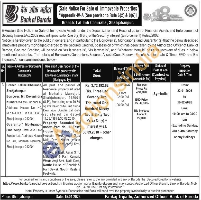 All part and parcel of Residential property situated at Mohalla Manujai, Shahjahanpur, 242001 (U.P.), Measuring area 79.79 sq.mtr. belongs to Smt. Surja Devi W/o Sundar Lal duly registered on dated 11.03.1987 & 30.08.2010.