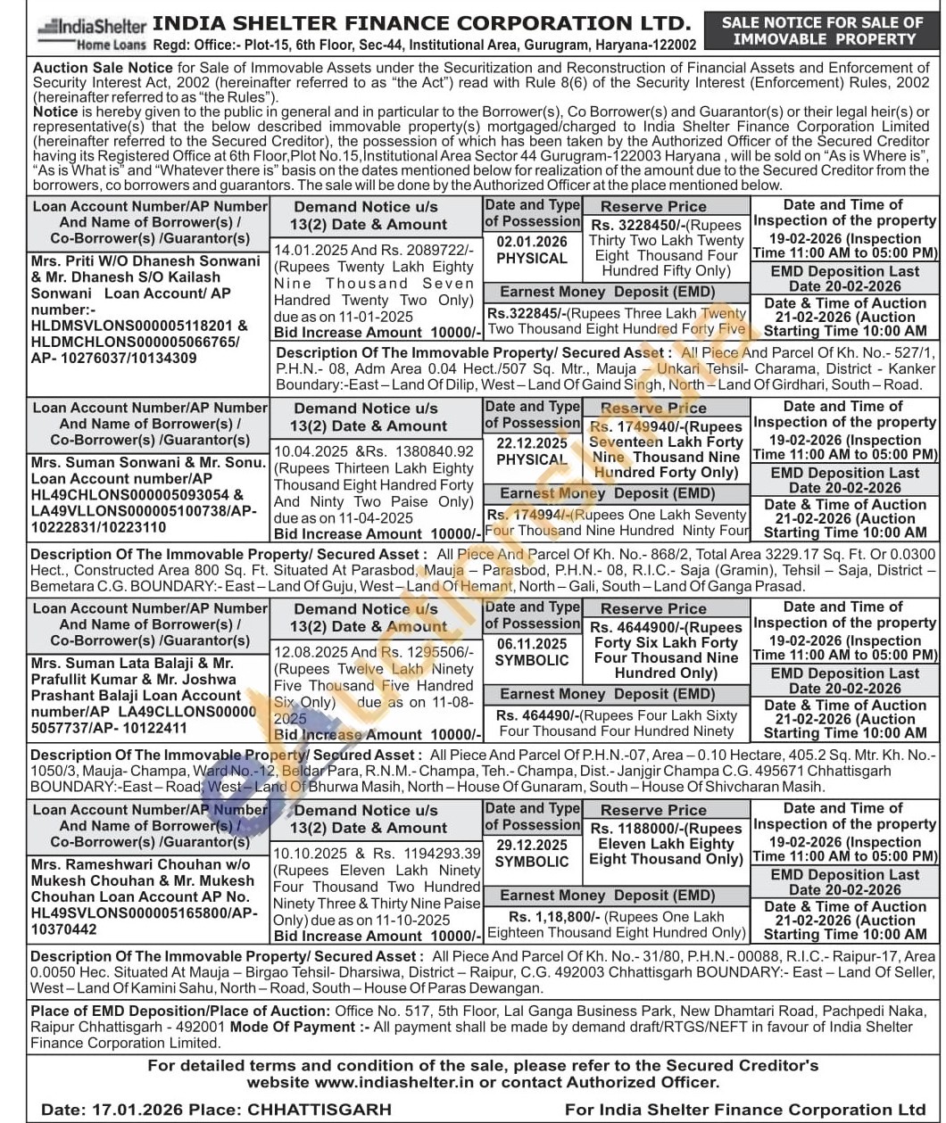 Description Of The Immovable Property/Secured Asset: All Piece And Parcel Of Kh. No.- 868/2, Total Area 3229.17 Sq. Ft. Or 0.0300 Hect., Constructed Area 800 Sq. Ft. Situated At Parasbod, Mauja Parasbod, P.H.N.- 08, R.I.C.- Saja (Gramin), Tehsil - Saja, District -Bemetara C.G. BOUNDARY:-East-Land Of Guju, West-Land Of Hemant, North-Gali, South-Land Of Ganga Prasad.