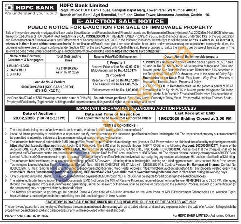 1) PROPERTY I in Demand Notice - All the pieces & parcel of 05.67 ares of land in Re.Sy. No.26/1/2 in Muvattupuzha Village and Taluk and Muvattupuzha Sub District in Ernakulam District more fully described in the Deed No.870/07 of SRO Muvattupuzha in the name of Daisy Biju. Boundaries as per Deed: East-Way, North-Way, West-Property of Mundakkal Thomas, South-Property of Daisy.