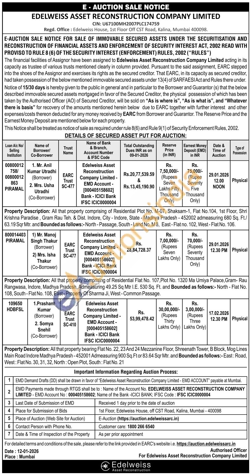 Property Description: All that property bearing Flat No. 22, 23 And 24 Mezzanine Floor, Shreenath Tower, B Block, Mog Lines Main Road Indore Madhya Pradesh-452001 Admeasuring 900 Sq. Ftor 83.64 Sqr Mtr. and Bounded as follows:- East: Road, West: Flat No. 30, 31, 32, North: Open Plot, South: Flat No. 21