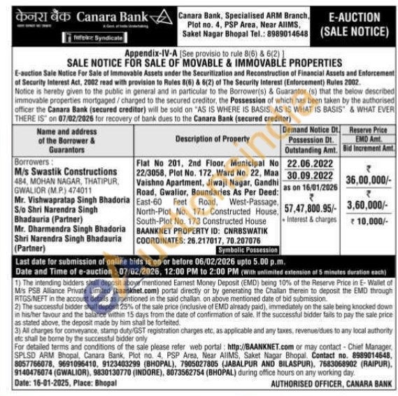 Flat No 201, 2nd Floor, Municipal No 22/3058, Plot No. 172, Ward No. 22, Maa Vaishno Apartment, Jiwaji Nagar, Gandhi Road, Gwalior, Boundaries As Per Deed: East-60 Feet Road, West-Passage. North-Plot No. 171 Constructed House, South-Plot No. 173 Constructed House BAANKNET PROPERTY ID: CNRBSWATIK COORDINATES: 26.217017, 70.207076
