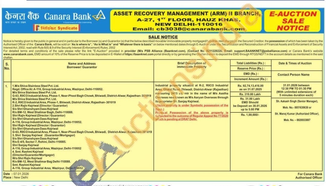 Industrial property situated at R-2, RIICO Industrial Area, Ghatal Road, Bhiwadi, District-Alwar (Rajasthan) measuring 2413 sq. mtr in the name of Mis Aastha Overseas now known as M/s Aaryan Overseas through Its proprietor Sh. Sanjay Kejriwal
