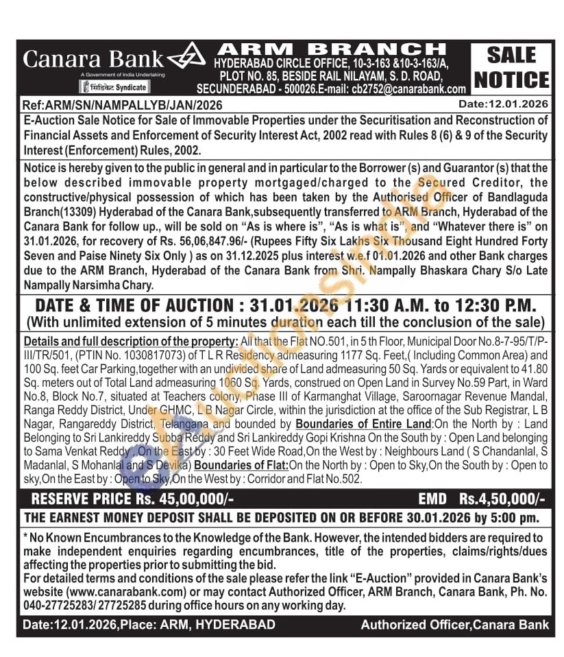 Details and full description of the property: All that the Flat NO.501, in 5 th Floor, Municipal Door No.8-7-95/T/P-III/TR/501, (PTIN No. 1030817073) of TLR Residency admeasuring 1177 Sq. Feet, (Including Common Area) and 100 Sq. feet Car Parking, together with an undivided share of Land admeasuring 50 Sq. Yards or equivalent to 41.80 Sq. meters out of Total Land admeasuring 1060 Sq. Yards, construed on Open Land in Survey No.59 Part, in Ward No.8, Block No.7, situated at Teachers colony, Phase III of Karmanghat Village, Saroornagar Revenue Mandal, Ranga Reddy District, Under GHMC, L B Nagar Circle, within the jurisdiction at the office of the Sub Registrar, L B Nagar, Rangareddy District, Telangana and bounded by Boundaries of Entire Land:On the North by: Land Belonging to Sri Lankireddy Subba Reddy and Sri Lankireddy Gopi Krishna On the South by: Open Land belonging to Sama Venkat Reddy, On the East by: 30 Feet Wide Road, On the West by: Neighbours Land (S Chandanlal, S Madanlal, S Mohanlal and S Devika) Boundaries of Flat: On the North by: Open to Sky, On the South by: Open to sky, On the East by: Open to Sky, On the West by: Corridor and Flat No.502.