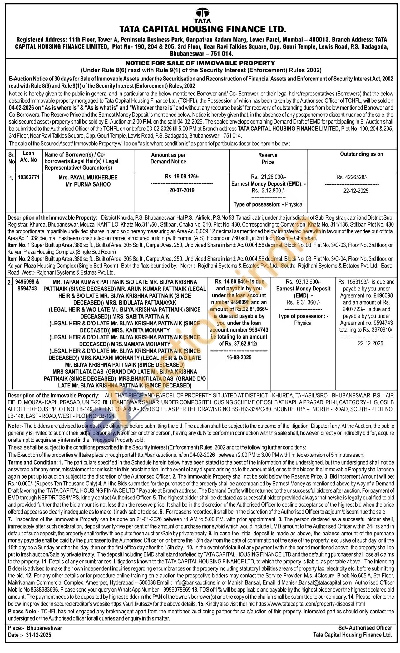 Description of the Immovable Property: District Khurda, P.S. Bhubaneswar, Hal P.S-Airfield, P.S.No 53, Tahasil Jatni, under the jurisdiction of Sub-Registrar, Jatni and District Sub-Registrar, Khurda, Bhubaneswar, Mouza-KANTILO, Khata No. 311/50, Stitban, Chaka No. 310, Plot No. 430, Corresponding to Conversion Khata No. 311/186, Stitiban Plot No. 430 the proportionate impartible undivided shares in land sold hereby measuring an Area Ac. 0.009. 12 decimal as mentioned below transferred herewith in favour of the vendee out of total Area Ac. 1.338 decimal has been constructed on framed structured building with normal (AS) Flooring on 780 sqft, in 3rd floor, Kisam-Gharabeni. Item No. 1 Super Built up Area 380 sq ft. Bult of Area. 305 Sqft, Carpet Area 250. Uncivided Share in land: Ac. 0.001.56 decimal Block No. 03, Flat No. 31C-03, Floor No. 3rd floor, on Kalyan Plaza Housing Complex (Single Bed Room) Item No. 2 Super Built up Area 380 sq ft. Built of Ares. 305 Sqft, Carpet Area 250. Uncivided Share island: Ac. 0.004.56 decimal Block No. 03, Flat No. 3/C-04, Floor No. 3rd floor, on Kalyan Plaza Housing Complex (Single Bed Room) Both the flats bounded by:-North: Rajdhani Systems & Estanes Pvt. Ltd. South:- Rajdhani Systems & Estates Pvt. Ltd.; East-Road, West:-Rajdhani Systems & Estates Pvt. Ltd.