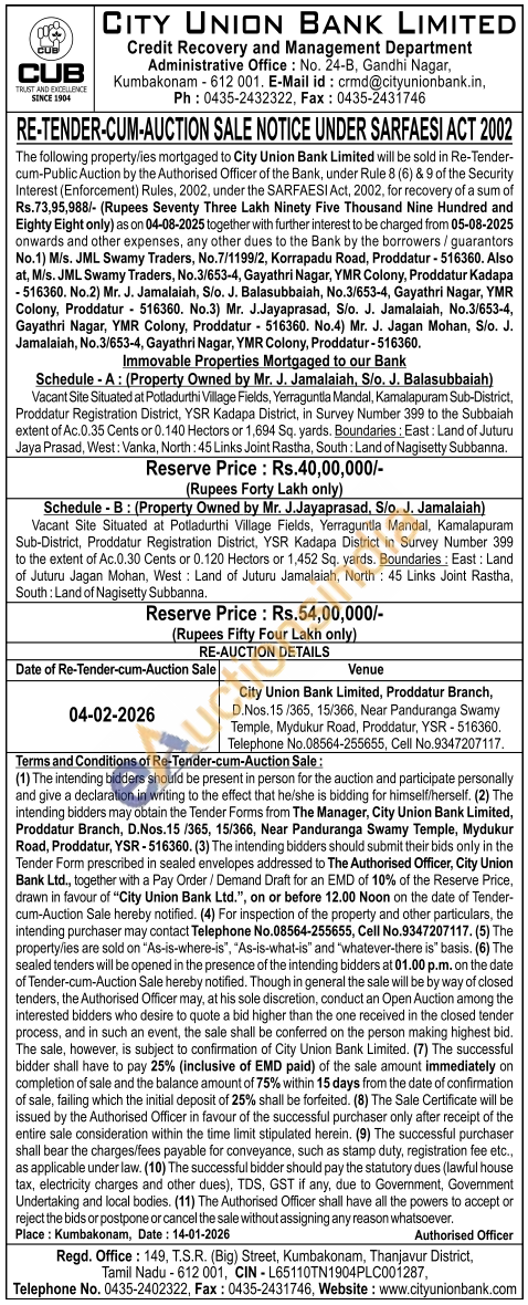Vacant Site Situated at Potladurthi Village Fields, Yerraguntla Mandal, Kamalapuram Sub-District, Proddatur Registration District, YSR Kadapa District in Survey Number 399 to the extent of Ac.0.30 Cents or 0.120 Hectors or 1,452 Sq, yards. Boundaries: East: Land of Juturu Jagan Mohan, West: Land of Juturu Jamalaiah, North: 45 Links Joint Rastha, South: Land of Nagisetty Subbanna.