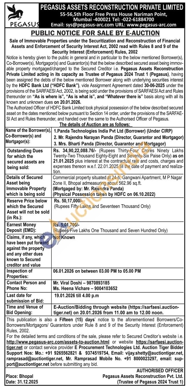 Commercial property situated at 24-b, Gangwani Apartment, MP Nagar Zone II, Bhopal admeasuring about 562.96 sq.ft. (Mortgaged by: Mr. Rajendra Panda) (