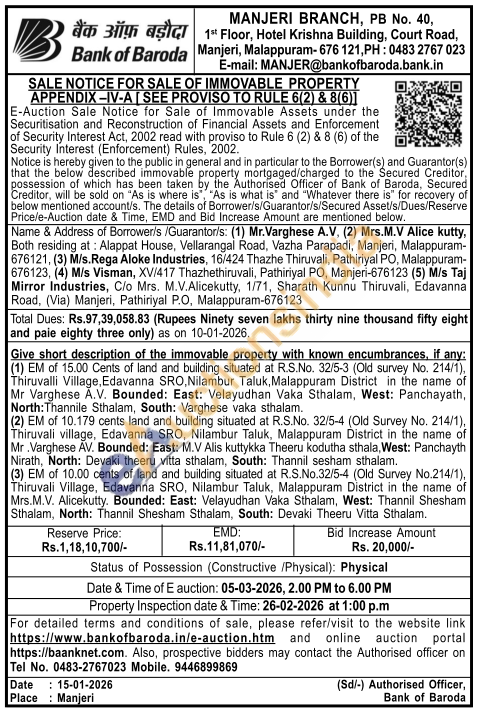 1) EM of 15.00 Cents of land and building situated at R.S.No. 32/5-3 (Old survey No. 214/1), Thiruvalli Village, Edavanna SRO, Nilambur Taluk, Malappuram District in the name of Mr Varghese A.V. Bounded: East: Velayudhan Vaka Sthalam, West: Panchayath, North: Thannile Sthalam, South: Varghese vaka sthalam. (2) EM of 10.179 cents land and building situated at R.S.No. 32/5-4 (Old Survey No. 214/1), Thiruvali village, Edavanna SRO, Nilambur Taluk, Malappuram District in the name of Mr. Varghese AV. Bounded: East: M.V Alis kuttykka Theeru kodutha sthala, West: Panchayth Nirath, North: Devaki theeru vitta sthalam, South: Thannil sesham sthalam. (3) EM of 10.00 cents of land and building situated at R.S.No.32/5-4 (Old Survey No.214/1), Thiruvali Village, Edavanna SRO, Nilambur Taluk, Malappuram District in the name of Mrs.M.V. Alicekutty. Bounded: East: Velayudhan Vaka Sthalam, West: Thannil Shesham Sthalam, North: Thannil Shesham Sthalam, South: Devaki Theeru Vitta Sthalam.