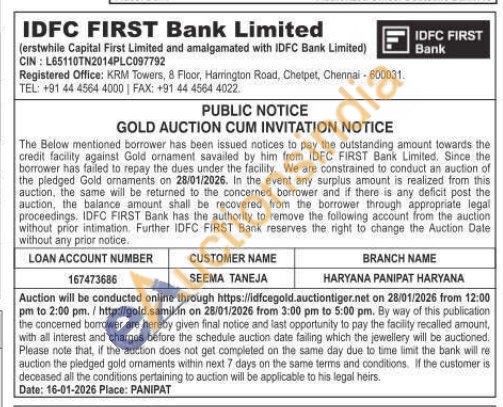 IDFC First Bank Ltd Gold Auctions Auction in Panipat