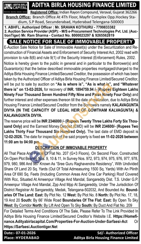 All That Piece And Parcel Of Flat No. 207 (G+3 Floors), On Second Floor, Constructed On Open Plot Bearing Nos. 9, 10 & 11, In Survey Nos. 972, 973, 974, 975, 976, 977, 978, 979, 980, 986 And 987 Known As "Sree Guru Raghavendra Residency", With Undivided Share Of Land 20 Sq. Yards (Out Of Total Admeasuring 1500 Sq. Yards) With An Plinth Area Of 690 Sq. Feets (Including Common Areas And One Car Parking) Roof Covered With Rcc, Situated At Ameenpur Village And Mandal, Sangareddy Dist. T.S. Under G.P. Ameenpur Village And Mandal, Zpp And Mpp At Sangareddy, Under The Jurisdiction Of District Registrar At Sangareddy, Medak, Telangana-502032, And Bounded As: Bound-aries Of The Land: East: By Plot No. 12 West: By Plot No. 8 North: By Plot No. 17, 18, 19 And 20 South: By 66' Wide Road Boundaries Of The Flat: East: By Open To Sky West: By Corridor North: By Lift And Open To Sky South: By Duct And Flat No. 209