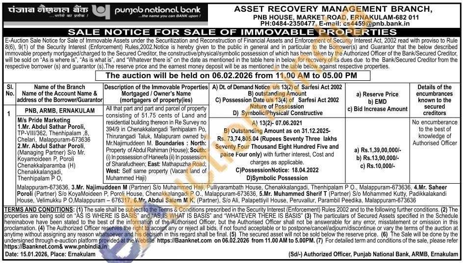 All that part and part and parcel of property consisting of 51.75 cents of Land and residential building thereon in Re Survey no 394/9 in Chenakkalangadi Tenhipalam Po, Thirurangadi Taluk, Malapuram owned by Mr.Najimuddeen M. Boundaries: North: Property of Abdul Rahiman (House); South: (i) In possession of Haneefa (ii) In possession of Sharafudheen; East: Mathapuzha Road; West: Self same property (Vacant land of Muhammed Haji)