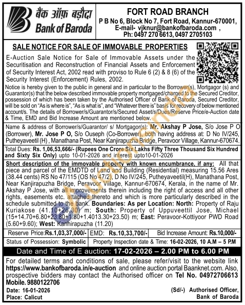 Short description of the immovable property with known encumbrance, if any: All that piece and parcel of the EMDTD of Land and Building (Residential) measuring 15.56 Ares (38.44 cents) RS No 47/115 (OS No 47/2), D No IV/245, Putheyaveetil (H), Manathana Post, Near Kanjirapuzha Bridge, Peravoor Village, Kannur-670674, Kerala, in the name of Mr. Akshay P Jose, with all improvements therein including the right of access and all other rights, easements etc. attached thereto and which is more particularly described in the schedule submitted to the bank. Boundaries: As per Location: North: Property of Raju Kuriakose (41.10+26.30) m; South: Property of Uppuveettil Jose, Michael (15+14.70+6.80+23.80+1.80+1.4013.30+23.50) m; East: Peravoor-Kottiyoor PWD Road (5.60+9.60); West: Kanhirapuzha (11.20)
