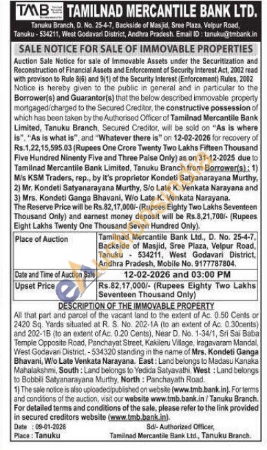 All that part and parcel of the vacant land to the extent of Ac. 0.50 Cents or 2420 Sq. Yards situated at R. S. No. 202-1A (to an extent of Ac. 0.30cents) and 202-1B (to an extent of Ac. 0.20 Cents), Near D. No. 1-34/1, Sri Sai Baba Temple Opposite Road, Panchayat Street, Kakileru Village, Iragavaram Mandal, West Godavari District, -534320 standing in the name of Mrs. Kondeti Ganga Bhavani, W/o Late Venkata Narayana. East: Land belongs to Madasu Kanaka Mahalakshmi, South: Land belongs to Yedida Satyavathi, West: Land belongs to Bobbili Satyanarayana Murthy, North: Panchayath Road.