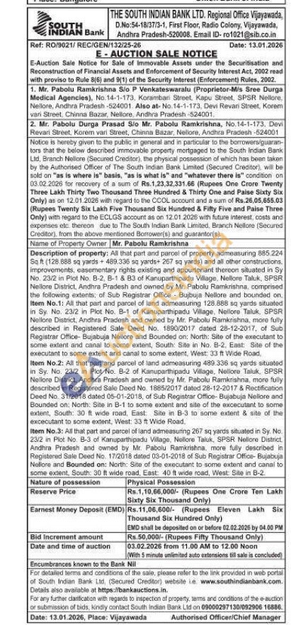 Description of property: All that part and parcel of property admeasuring 885.224 Sq ft (128.888 sq yards+ 489.336 sq yards+ 267 sq yards) and all other constructions. improvements, casementary rights existing and appurtenant thereon situated in Sy No. 23/2 in Plot No. B-2, B-1 & B3 of Kanuparthipadu Village, Nellore Taluk, SPSR Nellore District, Andhra Pradesh and owned by Mr. Pabolu Ramkrishna, comprised the following extents of Sub Registrar Office Bujbuja Nellore and bounded on, Item No.1: All that part and parcel of land admeasuring 128.888 sq yarde situated in Sy No. 23/2 in Plot No. B-1 of Kanuparthipadu Village. Nellore Taluk SPSR Nellore District, Andhra Pradesh and owned by Mr. Pabolu Ramkrishna, more fully described in Registered Sale Deed No. 1890/2017 dated 28-12-2017, of Sub Registrar Office-Bujabuja Nellore and Bounded on: North: Site of the executant to some extent and canal to some extent, South: Site in No. 8-2, East: Site of the executant to some extent and canal to some extent, West: 33 ft Wide Road