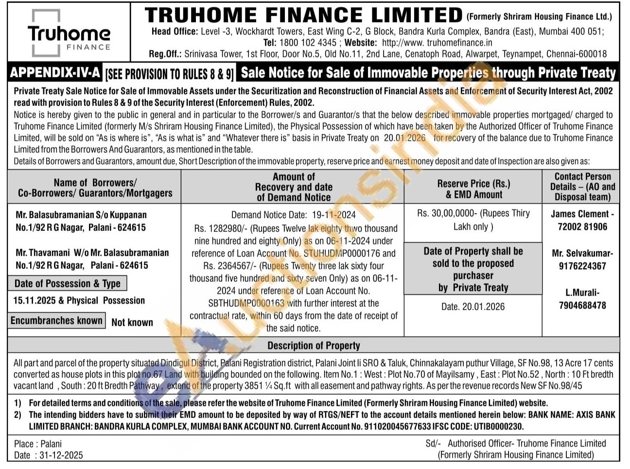 All part and parcel of the property situated Dindigul District, Palani Registration district, Palani Joint li SRO & Taluk, Chinnakalayam puthur Village, SF No.98, 13 Acre 17 cents converted as house plots in this plot no.67 Land with building bounded on the following. Item No.1: West: Plot No.70 of Mayilsamy, East: Plot No.52, North: 10 Ft bredth vacant land, South: 20 ft Bredth Pathway, extend of the property 3851 14 Sq.ft with all easement and pathway rights. As per the revenue records New SF No.98/45