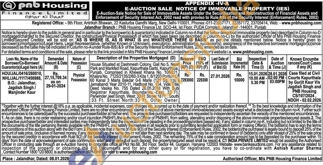 House Situated at Dashmesh Colony, Gail No 5, Near Park and Markfed Road, Kapurthala Garbi, Kapurthala, Punjab, Comprised in Khewat Khana No. 108/221 Khasra No. 7125/2135/2/60-3 Kita 1, 6/1203 Portion Of 60 Kanal 3 Marla Bakdar 0-6 Marle (121 Sq. Yds.) Jamabandi Year 2010-11, Hadbast No. 134, Vide Title Deed Vasika No. 755 Dated 26.05.2016 With Sub Registrar Kapurthala, Boundaries:-East: 33 Ft. Parwinder Jeet Singh, West: 33 Ft. Street 18 Ft., South 33 Ft. Street North:33 Ft. Other Owner.