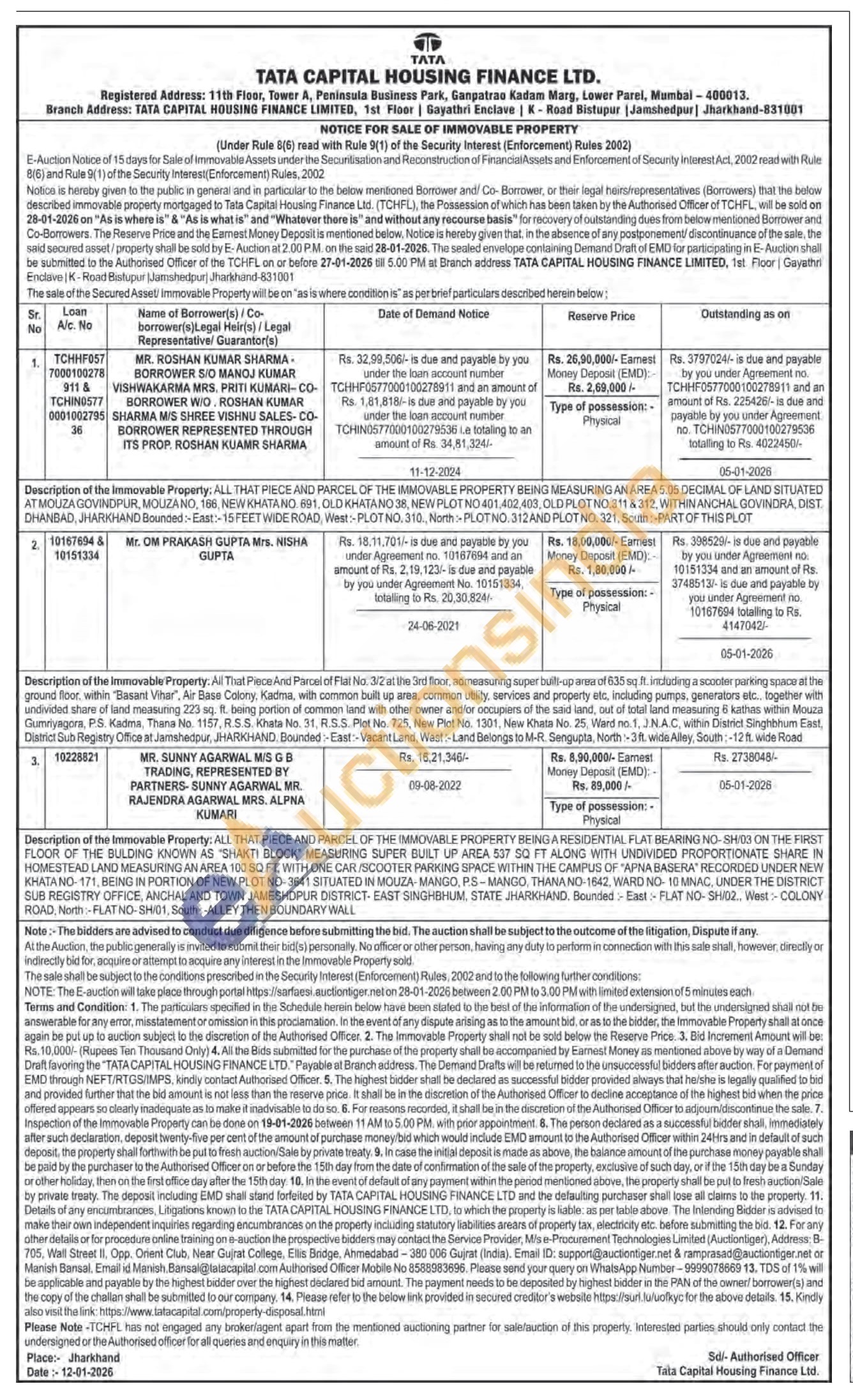 Description of the Immovable Property: ALL THAT PIECE AND PARCEL OF THE IMMOVABLE PROPERTY BEING A RESIDENTIAL FLAT BEARING NO-SHI ON THE FIRST FLOOR OF THE BULDING KNOWN AS "SHAKTI BLOCK MEASURING SUPER BUILT UP AREA 537 SQ FT ALONG WITH UNDIVIDED PROPORTIONATE SHARE IN HOMESTEAD LAND MEASURING AN AREA 100 SQ FT, WITH ONE CARISCOOTER PARKING SPACE WITHIN THE CAMPUS OF "APNA BASERA RECORDED UNDER NEW KHATANO-171, BEING IN PORTION OF NEW PLOT NO-3641 SITUATED IN MOUZA MANGO, PS-MANGO, THANAND-1642, WARD NO-10 MINAC, UNDER THE DISTRICT SUB REGISTRY OFFICE, ANCHAL AND TOWN JAMESHDPUR DISTRICT-EAST SINGHBHUM, STATE JHARKHAND Bounded-East-FLAT NO-SHI02, West: COLONY ROAD, North-FLAT ND-SH01, South: ALLEY THEN BOUNDARY WALL