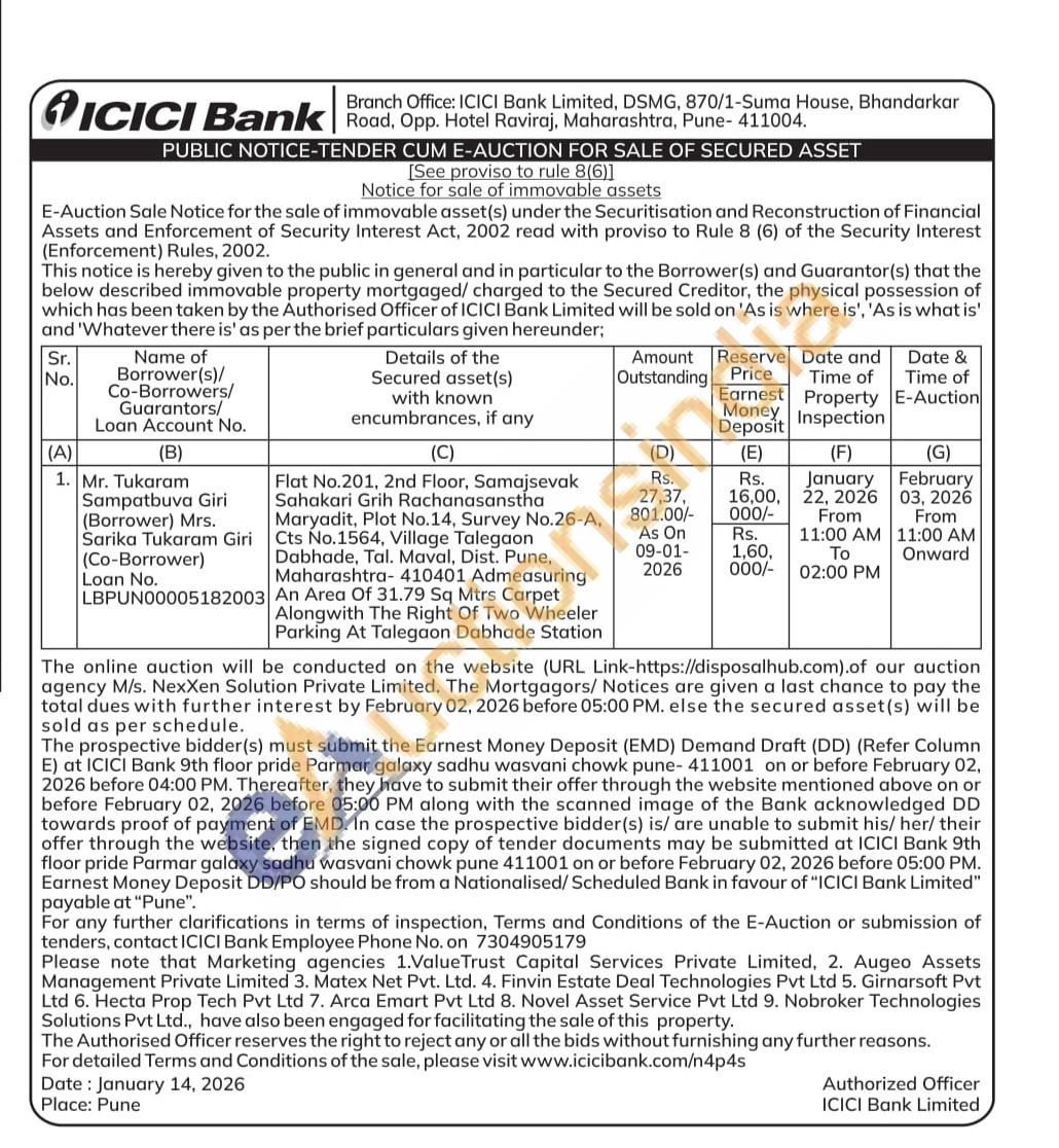 Flat No.201, 2nd Floor, Samajsevak Sahakari Grih Rachanasanstha Maryadit, Plot No.14, Survey No.26-A, Cts No.1564, Village Talegaon Dabhade, Tal. Maval, Dist. Pune, Maharashtra-410401 Admeasuring An Area Of 31.79 Sq Mtrs Carpet Alongwith The Right Of Two Wheeler Parking At Talegaon Dabhade Station