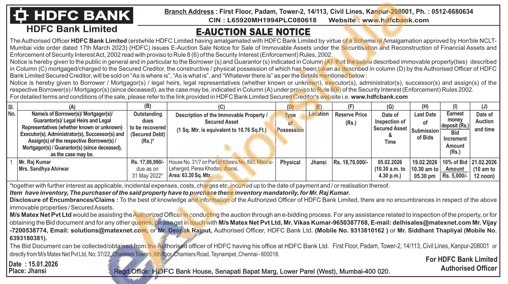 Mr. Deepak Rajput, Authorised Officer, HDFC Bank Ltd. (Mobile No. 9313810162) or Mr. Siddhant Thapliyal (Mobile No. 6393180381).