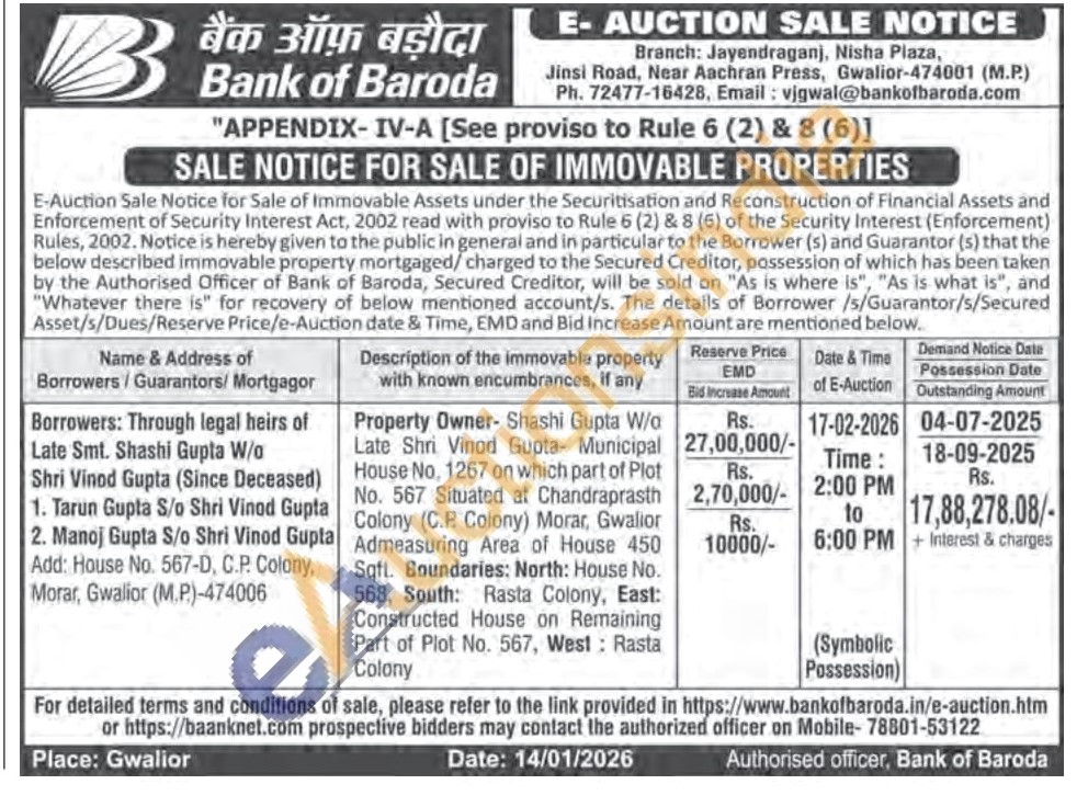 Property Owner- Shashi Gupta W/a Late Shri Vinod Gupta- Municipal House No, 1267 on which part of Plot No. 567 Situated at Chandraprasth Colony (C.P. Colony) Morar, Gwalior Admeasuring Area of House 450 Sqft. Boundaries: North: House No. 568, South: Rasta Colony, East: Constructed House on Remaining Part of Plot No. 567, West: Rasta Colony