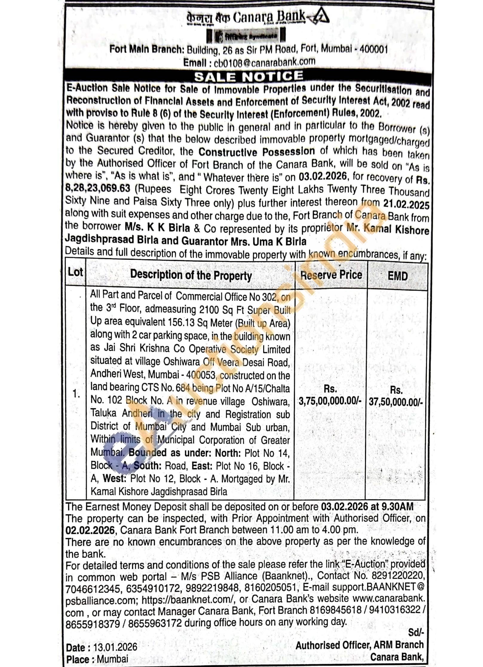 All Part and Parcel of Commercial Office No 302, on the 3rd Floor, admeasuring 2100 Sq Ft Super Built Up area equivalent 156.13 Sq Meter (Built up Area) along with 2 car parking space, in the building known as Jai Shri Krishna Co Operative Society Limited situated at village Oshiwara Off Veera Desai Road, Andheri West, Mumbai - 400053, constructed on the land bearing CTS No. 684 being Plot No A/15/Chalta No. 102 Block No. A in revenue village Oshiwara, Taluka Andheri in the city and Registration sub District of Mumbai City and Mumbai Sub urban, Within limits of Municipal Corporation of Greater Mumbai. Bounded as under: North: Plot No 14, Block A, South: Road, East: Plot No 16, Block-A, West: Plot No 12, Block A. Mortgaged by Mr. Kamal Kishore Jagdishprasad Birla