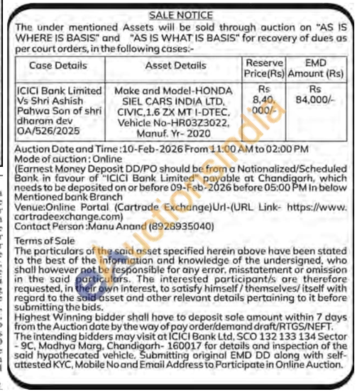 Make and Model-HONDA SIEL CARS INDIA LTD, CIVIC,1.6 ZX MT I-DTEC, Vehicle No-HR03Z3022, Manuf. Yr-2020
