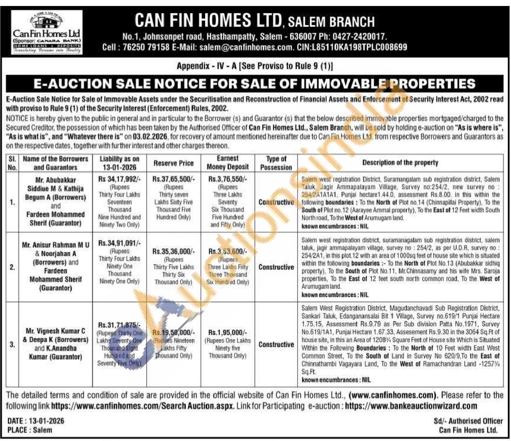 Salem west registration District, Suramangalam sub registration district, Salem Taluk, Jagir Ammapalayam Village, Survey no:254/2, new survey no 254/2A1A1A1, Punjai hectare1.44.0, assessment Rs.8.00. in this within the following boundaries: To the North of Plot no.14 (Chinnapillai Property), To the South of Plot no. 12 (Aarayee Ammal property), To the East of 12 Feet width South North road, To the West of Arumugam land. known encumbrances: NIL