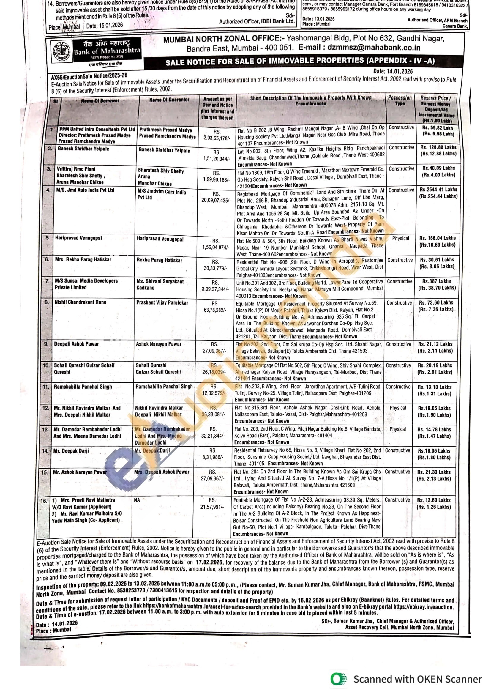 Equitable Mortgage Of Residential Property Situated At Survey No.59, Hissa No.1(P) Of Mouje Patharli, Taluka Kalyan Dist. Kalyan, Flat No.2 On Ground Floor, Building No. A, Admeasuring 925 Sq. Ft. Carpet Area In The Building Known As Jawahar Darshan Co-Op. Hsg Soc. Ltd., Situated At Shreekhandewadi Manpada Road, Dombivali East 421201, Tal Kalyaan Dist. Thane Encumbrances- Not Known