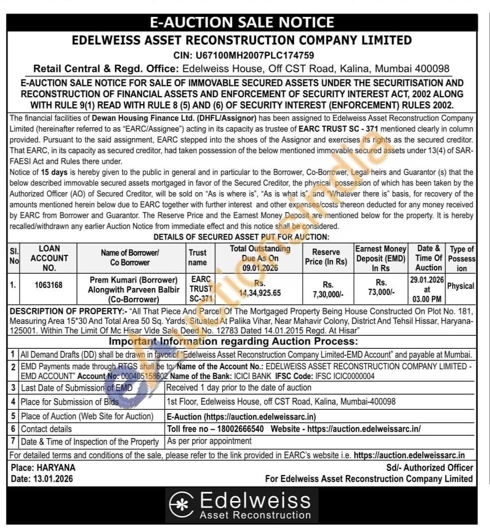 DESCRIPTION OF PROPERTY:- "All That Piece And Parcel Of The Mortgaged Property Being House Constructed On Plot No. 181, Measuring Area 15*30 And Total Area 50 Sq. Yards, Situated At Palika Vihar, Near Mahavir Colony, District And Tehsil Hissar, Haryana-125001. Within The Limit Of Mc Hisar Vide Sale Deed No. 12783 Dated 14.01.2015 Regd. At Hisar