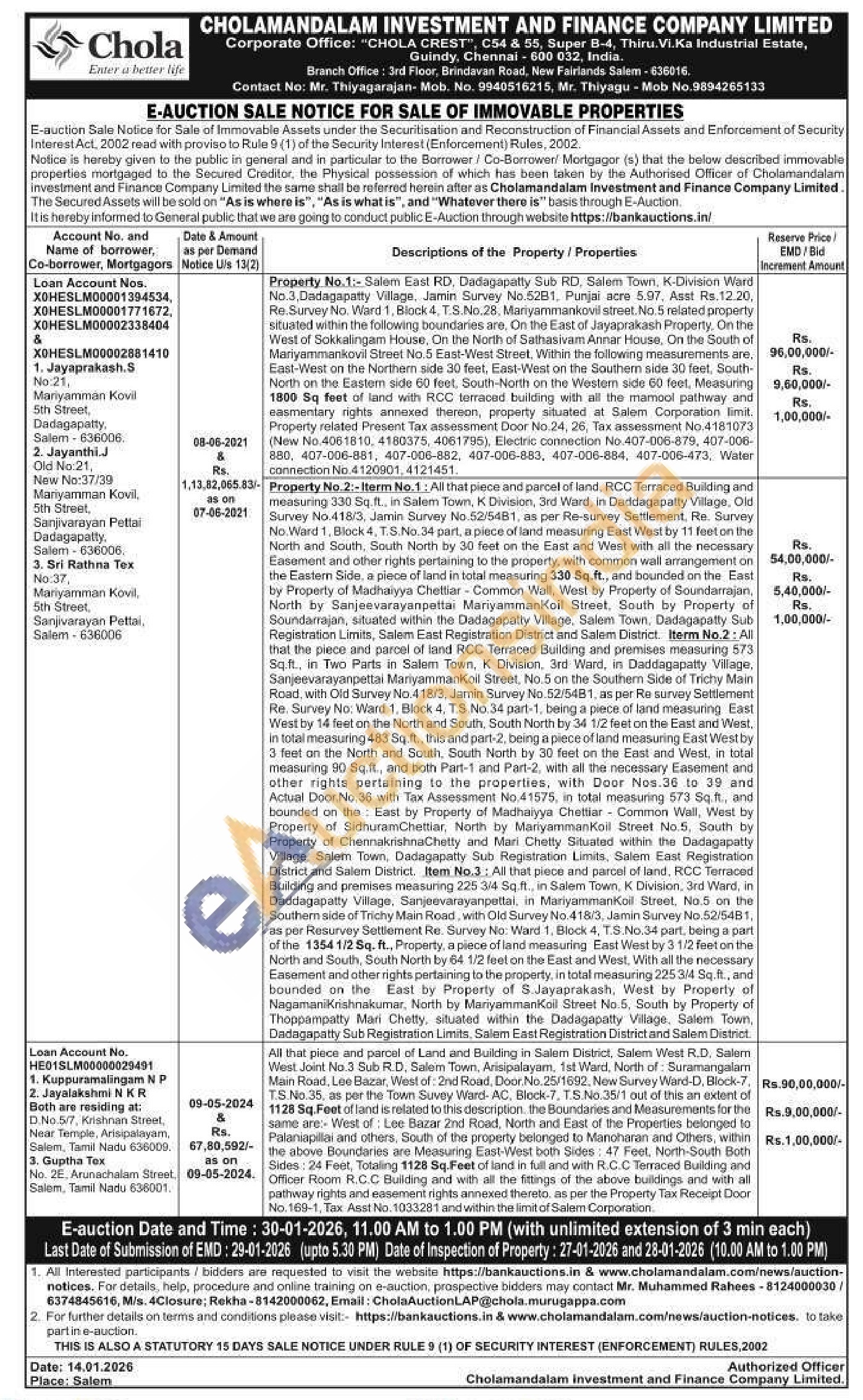Property No.1:-Salem East RD, Dadagapatty Sub RD, Salem Town, K-Division Ward No.3 Dadagapatty Village. Jamin Survey No.5281, Punjal acre 5.97. Asst Rs.12.20. Re Survey No Vilard 1, Block 4, T.S.No.28. Mariyammankovil street. No. 5 related property situated within the following boundaries are, On the East of Jayaprakash Property. On the West of Sokkalingam House, On the North of Sathasivam Annar House, On the South of Mariyammankovil Street No.5 East-West Street, Within the following measurements are. East-West on the Northern side 30 feet, East-West on the Southern side 30 feet, South-North on the Eastem side 00 feet. South-North on the Westem side 60 feet, Measuring 1800 Sq feet of land with RCC terraced building with all the mamool pathway and easmentary rights annexed thereon, property situated at Salem Corporation limit Property related Present Tax assessment Door No 24, 26, Tax assessment No.4181073 (New No. 4061810, 4180375, 4061795). Electric connection No 407-006-879, 407-006-880, 407-006-881, 407-006-882, 407-006-883, 407-006-884, 407-006-473, Water connection No.4120001,4121451