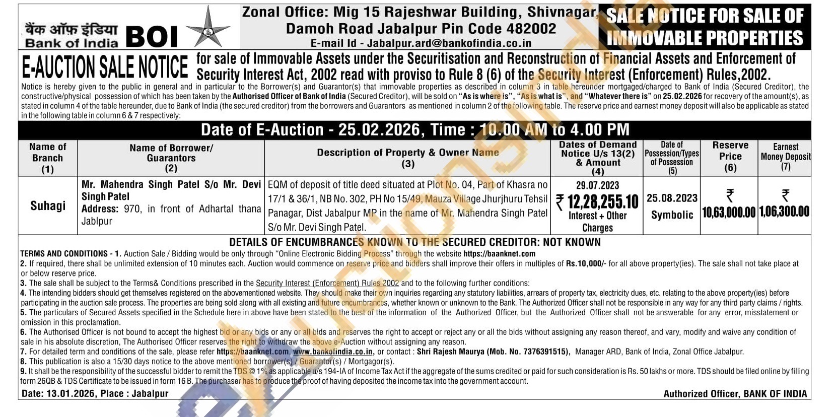 EQM of deposit of title deed situated at Plot No. 04, Part of Khasra no 17/1 & 36/1, NB No. 302, PH No 15/49, Mauza Village Jhurjhuru Tehsil Panagar, Dist Jabalpur MP
