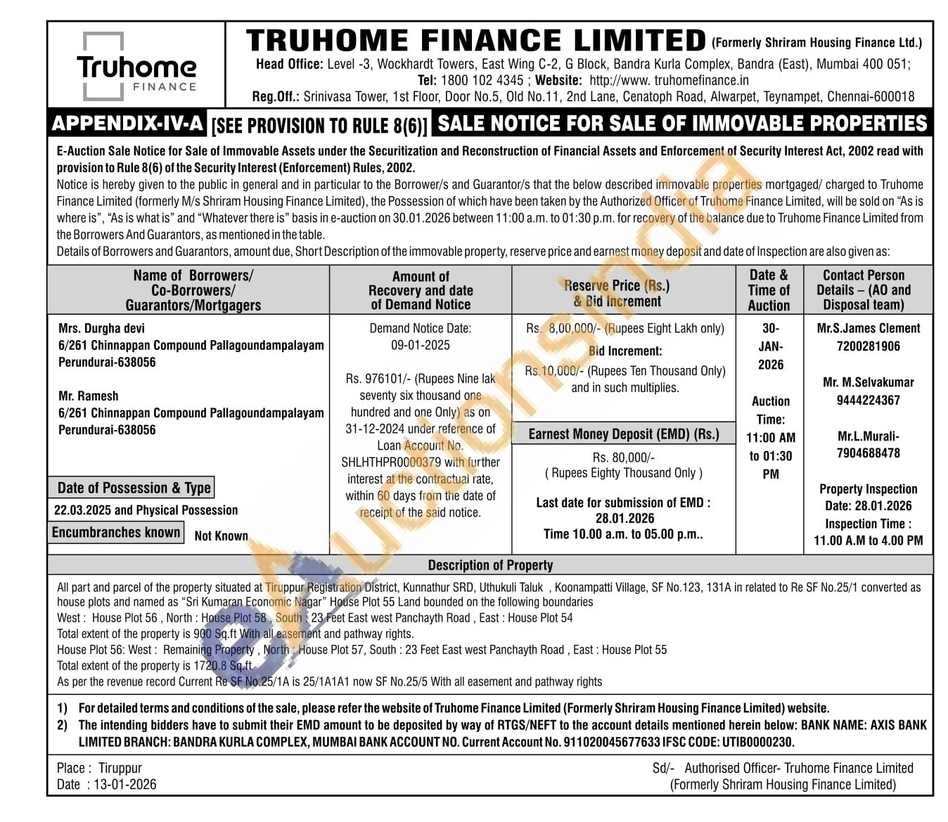 All part and parcel of the property situated at Tiruppur Registration District, Kunnathur SRD, Uthukuli Taluk, Koonampatti Village, SF No. 123, 131A in related to Re SF No.25/1 converted as house plots and named as "Sri Kumaran Economic Nagar" House Plot 55 Land bounded on the following boundaries West House Plot 56, North House Plot 58, South: 23 Feet East west Panchayth Road, East: House Plot 54 Total extent of the property is 900 Sq.ft With all easement and pathway rights
