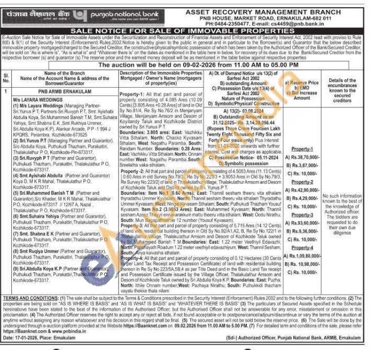Property-1: All that part and parcel of property consisting of 4.085 Ares (10.09) Cents (3805 Ares +0.28 Ares) of land in Old Sy No 81/4, Re Sy No. 76/2 in Menjanyam Village, Menjanyam Amsom and Desom of Koyilandy Taluk and Kozhikode District owned by Sri. Yunus PT Boundaries: 3.805 ares: East: Vazhikku Sthalam, West: Nagathu Paramba, South: Vita Sthalam. North: Chacko Kyvasam Randam Number. Boundaries: 0.28 Ares: East: Vazhikku Vitta Sthalam. North: Onnam number West: Nagathu Paramba South: Sreelathe vaka sthalam