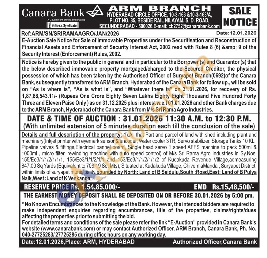 Details and full description of the property: 1). All that Part and parcel of land with shed including plant and machinery(Inkjet printer with eyemark sensor & encoder, Water cooler 3TR, Servo stabilizer, Storage Tanks 10 KL, Pipeline valves & fittings, Electrical pannel board, Single head servo 1 speed AFFS machine to pack 500ml & 1000ml, micro filter, rewinding machine with auto speed control) of M/s Sri Rama Agro Industries in Sy.Nos. 155/Ee3/1/1/2/1/1/1, 155/Ee3/1/1/2/1/1 and 153/Ee3/1/1/2/1/1/2 of Kudakuda Revenue Village,admeasuring 847.00 Sq Yards (Equivalent to 708.19 Sq. Mts), Situated at Kudakuda Village, ChivemlaMandal, Suryapet District. within limits of suryapet municipality bounded by North: Land of B Saidulu, South: Road, East: Land of B Pulya Naik, West: Land of K Venkanna.