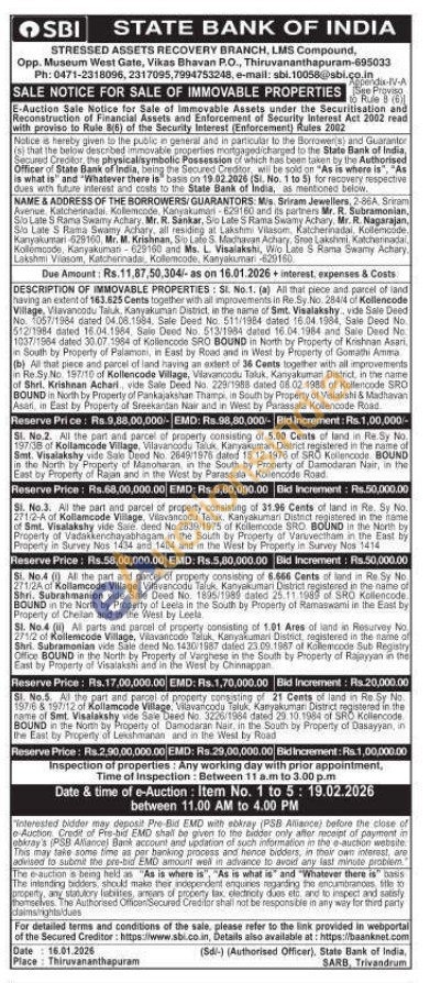 St. No.3. All the part and parcel of property consisting of 31.96 Cents of land in Re. Sy No. 271/2-A of Kollamcode Village Vilavancodu Taluk. Kanyakumari District registered in the name of Smt. Visalakshy vide Sare, deed No.2839/1975 of Kollencode SRO BOUND in the North by Property of Vadakkenchayabhagam in the South by Property of Varuvectham in the East by Property in Survey Nos 1434 and 1404 and in the West by Property in Survey Nos 1414
