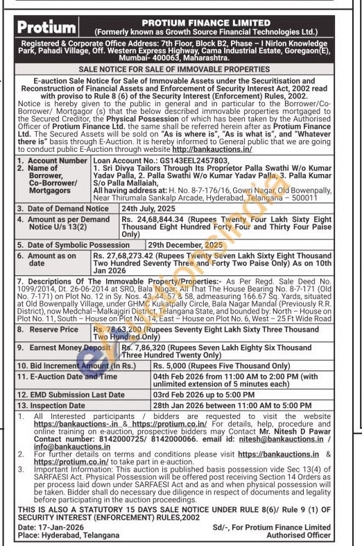 Descriptions Of The Immovable Property/Properties: As Per Regd. Sale Deed No. 1099/2014, Dt. 26-06-2014 at SRO, Bala Nagar: All That The House Bearing No. 8-7-171 (Old No. 7-171) on Plot No. 12 in Sy. Nos. 43, 44, 57 & 58, admeasuring 166.67 Sq. Yards, situated at Old Bowenpally Village, under GHMC Kukatpally Circle, Bala Nagar Mandal (Previously R.R. District), now Medchal-Malkajgiri District, Telangana State, and bounded by: North-House on Plot No. 11, South House on Plot No. 14, East House on Plot No. 6, West-25 Ft Wide Road