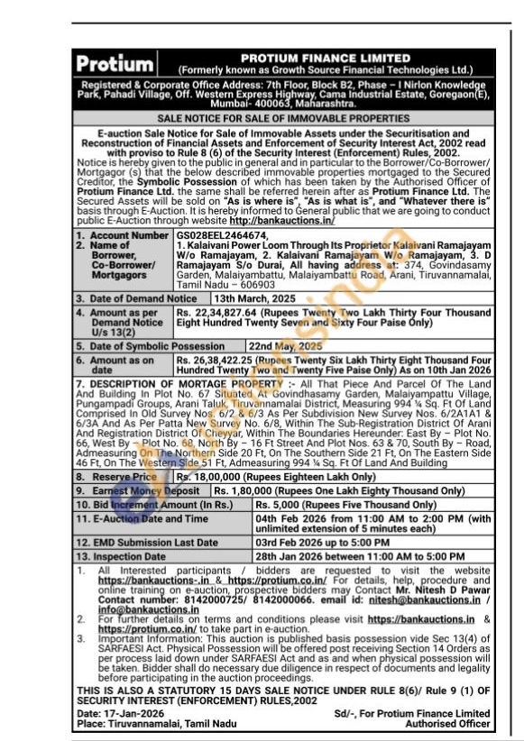 DESCRIPTION OF MORTAGE PROPERTY All That Piece And Parcel Of The Land And Building In Plot No. 67 Situated At Govindhasamy Garden, Malaiyampattu Village, Pungampadi Groups, Arani Taluk, Tiruvannamalai District, Measuring 994 Sq. Ft Of Land Comprised In Old Survey Nos. 6/2 & 6/3 As Per Subdivision New Survey Nos. 6/2A1A1 & 6/3A And As Per Patta New Survey No. 6/8, Within The Sub-Registration District Of Arani And Registration District Of Cheyyar, Within The Boundaries Hereunder: East By Plot No. 66, West By Plot No. 68, North By 16 Ft Street And Plot Nos. 63 & 70, South By - Road, Admeasuring On The Northern Side 20 Ft, On The Southern Side 21 Ft, On The Eastern Side 46 Ft, On The Western Side 51 Ft, Admeasuring 994 % Sq. Ft Of Land And Building