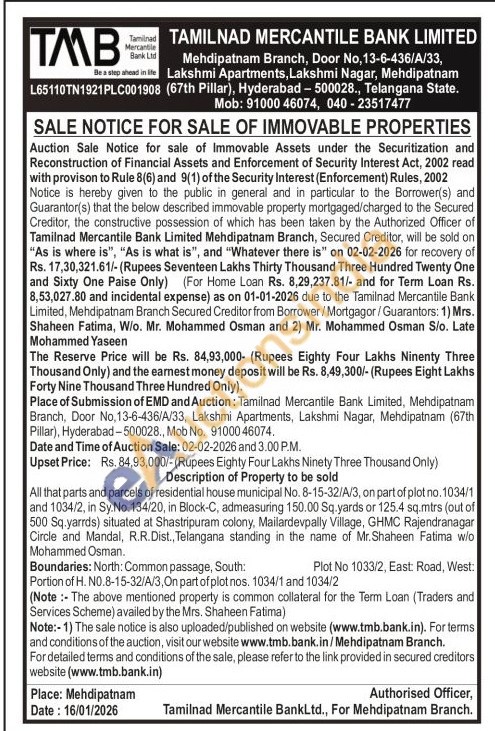 All that parts and parcels of residential house municipal No. 8-15-32/A/3, on part of plot no. 1034/1 and 1034/2, in Sy.No. 134/20, in Block-C, admeasuring 150.00 Sq.yards or 125.4 sq.mtrs (out of 500 Sq.yarrds) situated at Shastripuram colony, Mailardevpally Village, GHMC Rajendranagar Circle and Mandal, R.R.Dist., Telangana standing in the name of Mr.Shaheen Fatima w/o Mohammed Osman. Boundaries: North: Common passage, South: Plot No 1033/2, East: Road, West: Portion of H. N0.8-15-32/A/3, On part of plot nos. 1034/1 and 1034/2