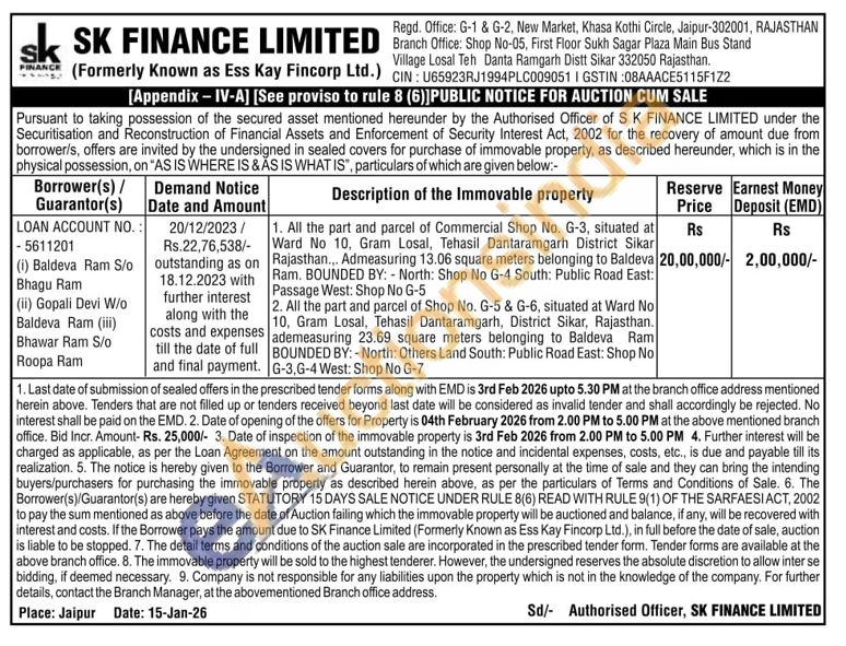 All the part and parcel of Commercial Shop No. G-3, situated at Ward No 10, Gram Losal, Tehasil Dantaramgarh District Sikar Rajasthan... Admeasuring 13.06 square meters belonging to Baldeva Ram. BOUNDED BY: - North: Shop No G-4 South: Public Road East: Passage West: Shop No G-5 2. All the part and parcel of Shop No. G-5 & G-6, situated at Ward No 10, Gram Losal, Tehasil Dantaramgarh, District Sikar, Rajasthan. ademeasuring 23.69 square meters belonging to Baldeva Ram BOUNDED BY:-North: Others Land South: Public Road East: Shop No G-3,G-4 West: Shop No G-7