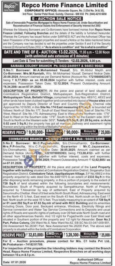 DESCRIPTION OF PROPERTY: All the piece and parcel of the Land Property together with building situated at Coimbatore Registration District, Singanallur Sub Registration District, Coimbatore Taluk, Uppilipalayam Village, SF No.488/2 in this property acquired by sale deed Doc No.648/1975 to an extent of 2333 Sq.ft in this after disposing lands remaining property, in this a portion of property to the extent of 728 Sq.ft of land situated within the following boundaries and measurements Boundaries South of Property acquired by Sampathkumar, North of Property acquired by TAlexandar by way of settlement, East of Property acquired by Savurimuthu Chettiar, West of 9 feet wide North South Road, Admeasuring: East west on the North 43 feet. East west on the South 43 feet, North south on the East 17 feet. North south on the west 16 % feet, Thus totally measuring to an extent of 728 Sq.ft or 01 cent 292 Sq.ft or 67.63 Sq.mtr of land with RCC Building and its amenities including Doors, Door post, Backyard entrance, Windows, Electricity fittings and Service connection and Water Tap Service Connections and its Deposits and usual rights of Roads and specific rights of pathway over 09 feet wide North South road and all other appurtenances thereto. And 1/2 right for Pugazhenthi over East West wall situated in Southern portion of the property and 1/2 right for Alexander. Door No.3 Part, Police Colony, Old Ward No. 8, New Ward No.62, EB SC No.03-047-009-901, Did Assessment No.26381 Part, New Assessment No.26200 Part, The above said properly is situated within the limits of Coimbatore Corporation.