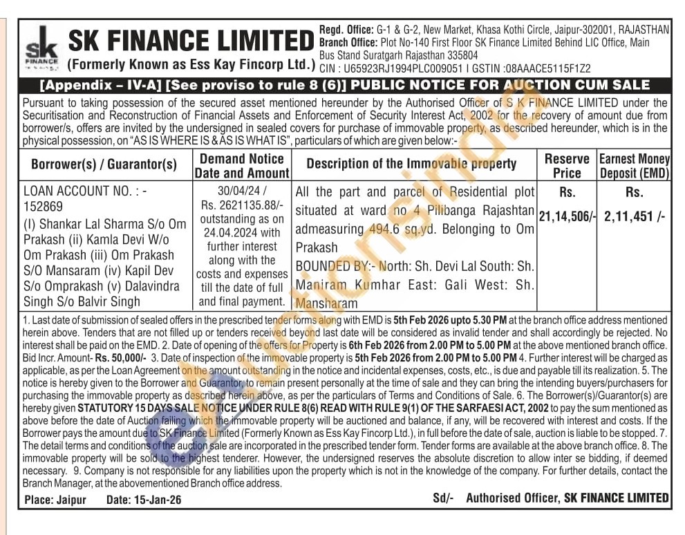 All the part and parcel of Residential plot admeasuring 494.6 sq.yd. Belonging to Om situated at ward no 4 Pilibanga Rajashtan Prakash