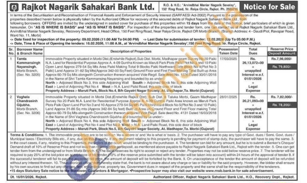 Immovable Property situated in Morbi Dist. (Erstwhile Flajkot), Sub Dist. Morbi, Madhapar gaam Survey No 20 Palki N.A. Land for Residential Purpose Approx A. 4-09 Guntha Known as Maruti Park Plots Palki Plot No 3 and 10 Paiki Open Land Approx 279-54 Sq Mts Area Paiki Making Total 9 Blocks Palki Northward Side Block No 4(Plot No 3 Palki) Land Approx 31-82 Sq Mts(Approx 342-00 Sq Feet) Ground Floor and First Floor Making Total Built up Area Approx 60-79 Sq Mts alongwith Construction thereon acquired Vide Regd. Sale deed No. 1536 Dated 30/01/2018 in the Name of Shri Tamta Kammansing Nayansing and bounded by as under- North Adjoined Block No 3, this side Adjoining Wall South Adjoined Block No 5, this side Adjoining Wall East: Land of Adjoining Plot No.4 West: N.A. Land Paiki Road, this side door of block Property Address:- Maruti Park, Block No.4, B/h Gayatri Nagar Society, At. Madhapar, Ta. Morbi (Gujarat)